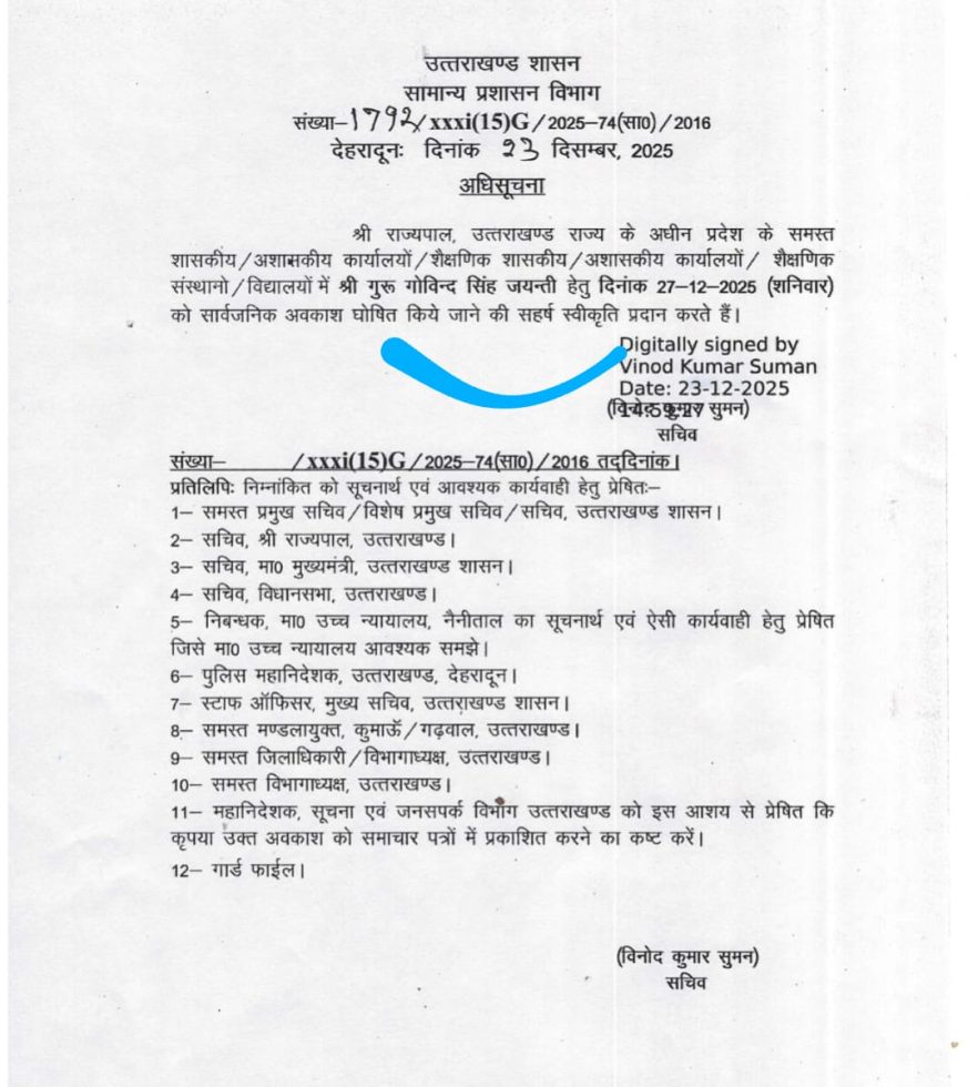 राज्यपाल, उत्तराखण्ड राज्य के अधीन प्रदेश के समस्त शासकीय/अशासकीय कार्यालयों / शैक्षणिक शासकीय/अशासकीय कार्यालयों / शैक्षणिक संस्थानो / विद्यालयों में श्री गुरू गोविन्द सिंह जयन्ती हेतु दिनांक 27-12-2025 (शनिवार) को सार्वजनिक अवकाश घोषित किये जाने की सहर्ष स्वीकृति प्रदान करते हैं।