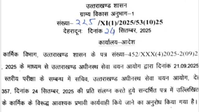 कार्मिक विभाग, उत्तराखण्ड शासन के पत्र संख्या-452/XXX (4)2025-2(09)25 दिनाक 24 सितम्बर, 2025 के माध्यम से उत्तराखण्ड अधीनस्थ सेवा चयन आयोग द्वारा दिनांक 21.09.2025 को आयोजित स्नातक स्तरीय परीक्षा के सम्बन्ध में सचिव, उत्तराखण्ड अधीनस्थ सेवा चयन आयोग, देहरादून के पत्र संख्या-357, दिनांक 24 सितम्बर, 2025 की प्रति संलग्न करते हुये सन्दर्भित पत्र में उल्लिखित ग्राम्य विकास विभाग के कार्मिक के विरूद्ध आवश्यक प्रभावी कार्यवाही किये जाने का अनुरोध किया गया है। इस सम्बन्ध में सचिव, उत्तराखण्ड अधीनस्थ सेवा चयन आयोग, देहरादून के उक्त सन्दर्भित पत्र के माध्यम से यह अवगत कराया गया है कि उत्तराखण्ड अधीनस्थ सेवा चयन आयोग के द्वारा दिनांक 21.09.2025 को स्नातक स्तरीय पदों हेतु राज्य के विभिन्न जनपदों में लिखित प्रतियोगी परीक्षा आयोजित की गयी थी। उक्त प्रतियोगी परीक्षा के दौरान जनपद हरिद्वार के परीक्षा केन्द्र आदर्श बाल सदन इण्टर कॉलेज, ग्राम्य व पोस्ट बहादरपुर, जट, हरिद्वार, केन्द्र कोड-1302 में एक अभ्यर्थी द्वारा प्रश्नपत्र के 12 प्रश्नों की मोबाइल से फोटो खीचकर परीक्षा केन्द्र से बाहर भेजने का मामला प्रकाश में आया। यद्यपि उक्त परीक्षा केन्द्र में परीक्षा की सुचिता एवं पारदर्शिता बनाये रखने हेतु विभिन्न जनपद स्तरीय अधिकारियों/कार्मिकों की तैनाती की गयी परन्तु उक्त घटना से यह स्पष्ट है कि सम्बन्धित अधिकारियों/कार्मिकों के द्वारा उक्त केन्द्र पर पर्यवेक्षण का कार्य भली-भाँति नहीं किया गया। जिससे प्रथम दृष्टया यह प्रतीत होता है कि उक्त प्रयोजन हेतु तैनात अधिकारी / कार्मिक अपने कार्य दायित्वों के प्रति संवेदनशील नहीं थे, जिससे परीक्षा पर भी प्रश्न चिह्न लगा है व विभिन्न संगठन आन्दोलित है। अतः उक्त सम्बन्धित अधिकारियों/कार्मिकों के विरूद्ध समुचित कार्यवाही किये जाने का अनुरोध किया गया है।